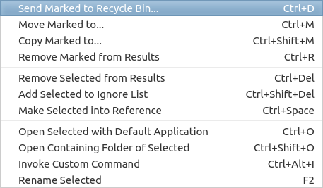 現(xiàn)在,你可以決定下一步如何操作。你可以刪除這個(gè)重復(fù)的文件,或者對(duì)它進(jìn)行重命名,抑或是 復(fù)制/移動(dòng) 到另一個(gè)位置。為此,選定該重復(fù)文件,或在菜單欄中選定寫(xiě)有“僅顯示重復(fù)”選項(xiàng) ,如果你選擇了“僅顯示重復(fù)”選項(xiàng),則只有重復(fù)文件在窗口中可見(jiàn),這樣你便可以輕松選擇并刪除這些文件。點(diǎn)擊“操作”下拉菜單,最后選擇你將執(zhí)行的操作。在這里,我只想刪除重復(fù)文件,所以我選擇了“移動(dòng)標(biāo)記文件到垃圾箱”這個(gè)選項(xiàng)。