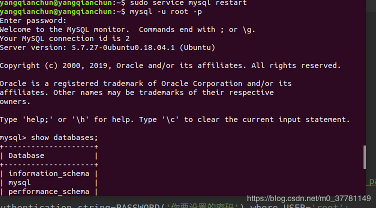 然后輸入指令quit,退出mysql,執(zhí)行重啟mysql指令sudo service mysql restart;