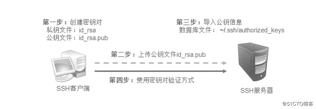 密鑰對驗證:要求提供相匹配的密鑰信息才能通過驗證。通常先在客戶端中創(chuàng)建一對密鑰文件(公鑰、私鑰),然后將公鑰文件放到服務(wù)器中的指定位置。遠(yuǎn)程登錄時,系統(tǒng)將使用公鑰,私鑰進(jìn)行加密/解密關(guān)聯(lián)驗證,大大增強(qiáng)了遠(yuǎn)程管理的安全性。該方式不易被假冒,且可以免交互登錄,在Shell中被廣泛使用。