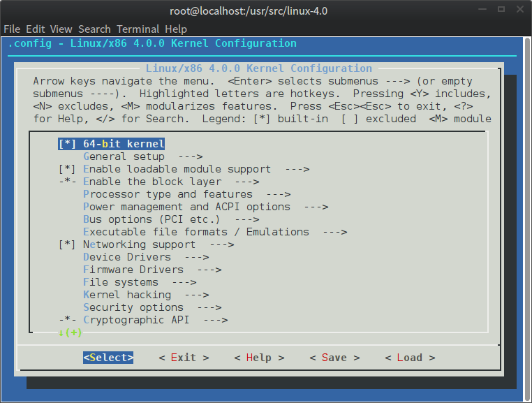 現(xiàn)在我們在shell或終端中運(yùn)行make menuconfig命令來配置Linux內(nèi)核。我們執(zhí)行以下命令后會(huì)顯示一個(gè)包含所有菜單的彈出窗口。在這里我們可以選擇我們新的內(nèi)核配置。如果你不熟悉這些菜單,那就敲擊ESC鍵兩次退出。