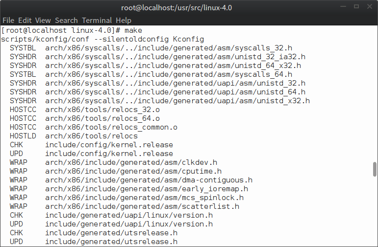 下一步,我們會(huì)執(zhí)行make命令來編譯內(nèi)核4.0。取決于你的系統(tǒng)配置,編譯至少需要20-30分鐘。
