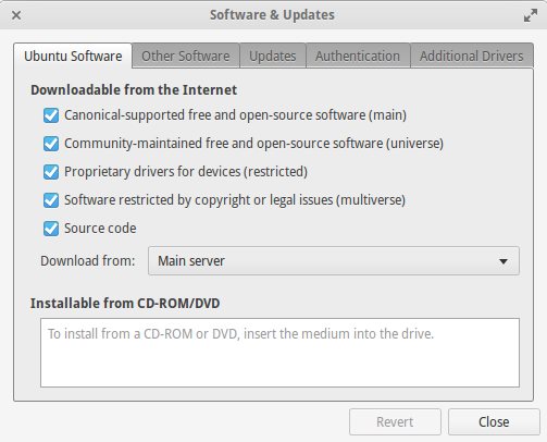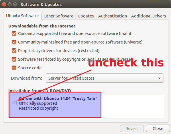 在Ubuntu Software的第一個標簽中,找到cdrom,如果它是勾選的,那么取消勾選。