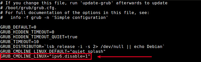 用文本編輯器打開 /etc/default/grub 并給GRUBCMDLINELINUX變量添加"ipv6.disable=1"。