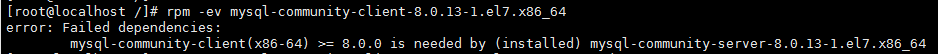 [root@localhost /]# rpm -ev mysql-community-client-8.0.13-1.el7.x86_64 --nodeps