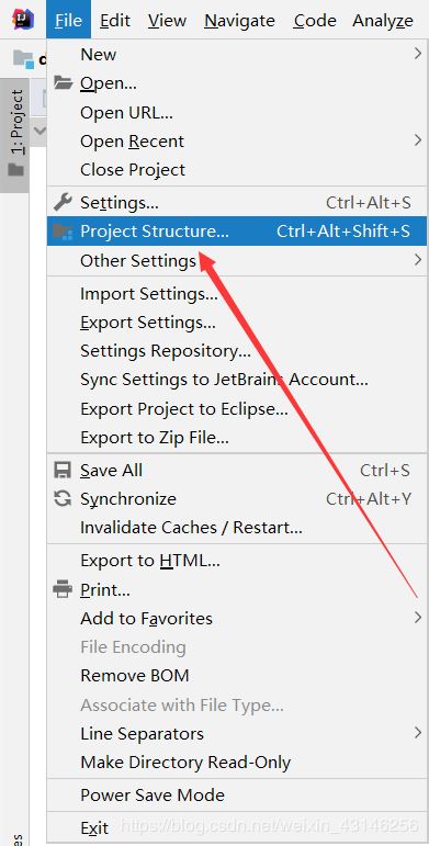 1.打開Project Structure...(項目結(jié)構(gòu)...),也可以使用快捷鍵:Ctrl+Alt+Shift+S