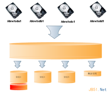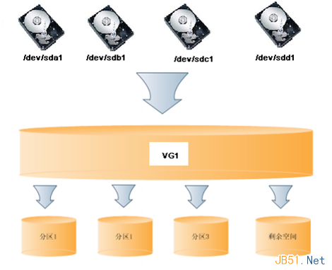由N個(gè)磁盤(pán)可以組成一個(gè)很大的空間VG1,然后從VG1上面劃分需要使用的分區(qū)。