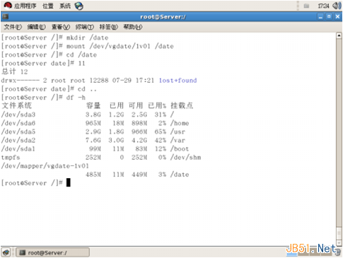 8、Linux下的文件系統(tǒng)需要被掛載之后才能使用,我們先使用mkdir /date 命令創(chuàng)建一個(gè)空目錄,然后用 mount /deta/vgdate/lv01 /date 命令將我們的lv01分區(qū)掛載到/date目錄下,至此我們新創(chuàng)建的lv就可以使用了。