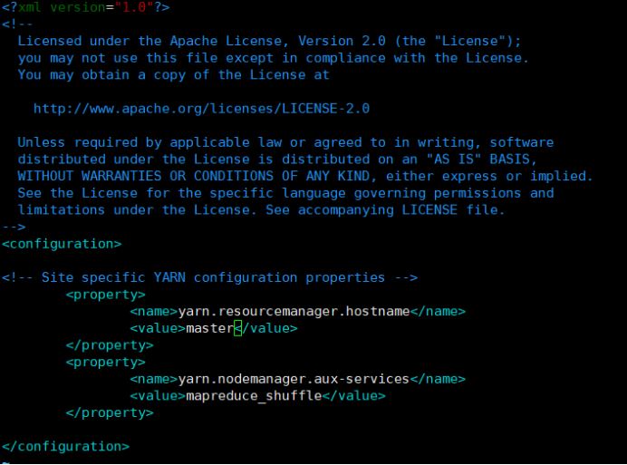 <property> <name>yarn.resourcemanager.hostname</name> <value>master</value> </property> <property> <name>yarn.nodemanager.aux-services</name> <value>mapreduce_shuffle</value> </property>