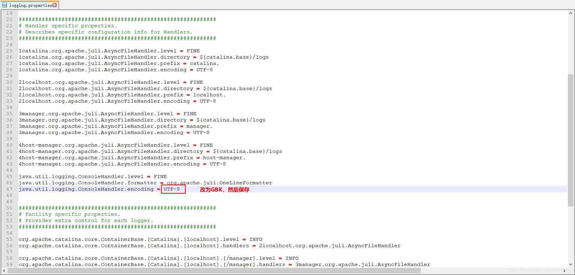 找到Tomcat文件下的conf目錄,修改logging.properties文件中java.util.logging.ConsoleHandler.encoding對應(yīng)的值為GBK