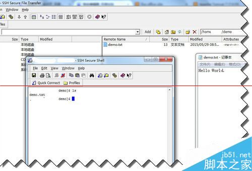 1、首先,通過 SSH 在某臺 *nix 上,進行 demo 目錄,這里假設是 /home/duser/demo,并存放一份名叫 demo.txt 的文件,上面寫著第一行 Hello World.
