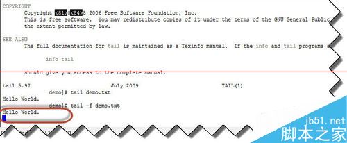 2、下面我們使用 tail -f demo.txt 命令來看看效果。在圖中,我們可以看到,該命令一直掛起著,說明在等待變化,隨后輸出。