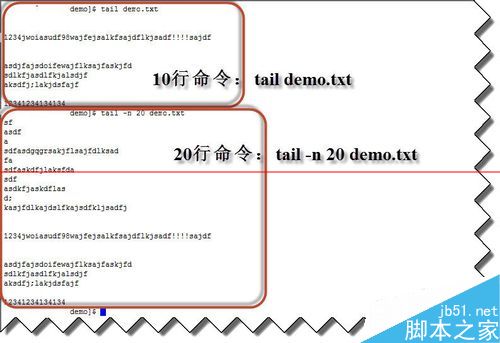 1、下面我們使用 tail demo.txt 命令來看看效果。細心的將會發(fā)現(xiàn),這個命令顯示完之后,很快就退出當前命令了,說明它不會自動滾動。