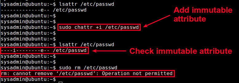 為了讓一個文件不可變更,你需要按照如下方法為這個文件添加“不可變更”標志位。例如,對/etc/passwd文件做寫保護: