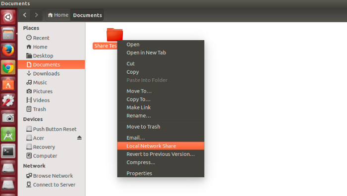 為了在Ubuntu上實(shí)現(xiàn)局域網(wǎng)共享文件夾,右鍵點(diǎn)擊打算共享的文件夾,并選擇“Local Network Share(本地網(wǎng)絡(luò)共享)”: