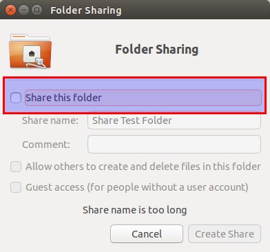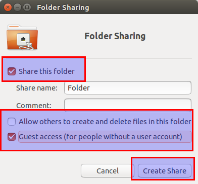 當(dāng)選中“Share this folder”的選項(xiàng),就會(huì)看到按鈕“Create Share(創(chuàng)建共享)”變得可以點(diǎn)擊了。你也可以“Allow others to create and delete fies in this folder(允許其他用戶(hù)在共享文件夾中編輯文件)”。選項(xiàng)“Guest access(允許訪客訪問(wèn))”也是如此。