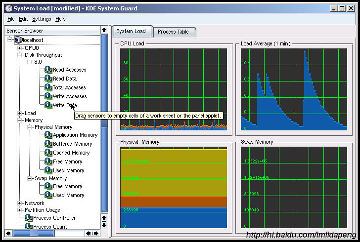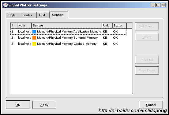 系統(tǒng)負(fù)載工作表有四個傳感器窗口:CPU負(fù)載,平均負(fù)載(1分鐘),物理內(nèi)存,和交換內(nèi)存。多個傳感器可以顯示在同一窗口中。要了解窗口顯示的是哪些傳感器,將鼠標(biāo)移動到圖形上就會顯示對應(yīng)的說明。你也可以在圖形上右鍵點(diǎn)擊Properties,然后點(diǎn)擊Sensors標(biāo)簽(見下圖)。這里也顯示了各傳感器在圖形中所對應(yīng)的顏色。