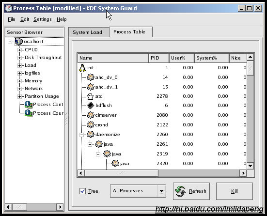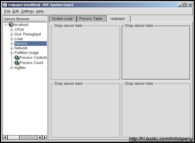 KSysguard主窗體包括菜單欄、工具欄和狀態(tài)欄、傳感器瀏覽區(qū)以及工作區(qū)。當(dāng)初次啟動后,你可以看到默認(rèn)的界面:本機(jī)localhost列在傳感器瀏覽區(qū)中,在工作區(qū)中有兩個標(biāo)簽。