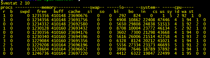 每隔2秒輸出vmstat的信息,共輸出10次。