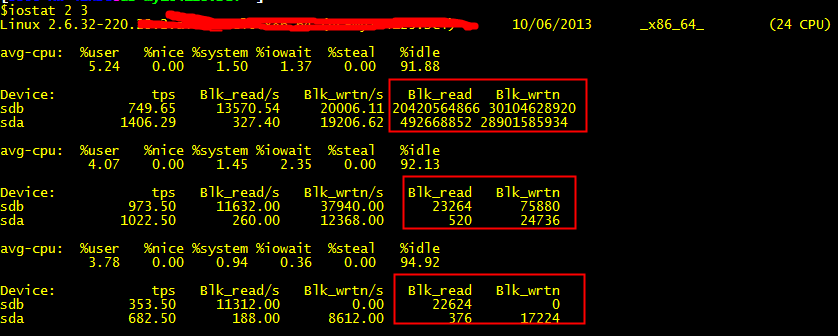備注:該命令包含了cpu信息和磁盤IO信息,這里簡(jiǎn)單介紹下有關(guān)磁盤IO的幾個(gè)參數(shù)。需要注意的是,第一次blk_read和blk_wrtn是統(tǒng)計(jì)的歷史總數(shù),后面是每一秒的變化數(shù)。
