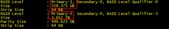 sudo MegaCli64 -LDInfo -Lall -aALL | egrep '(RAID|Size)'