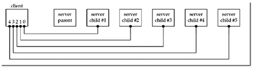 for(i=0;i<5;++i){//與服務器建立五個連接,以使得服務器創(chuàng)建5個子進程