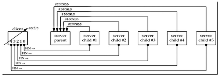 當客戶終止時,所以打開的描述子均由內核自動關閉,因此5個連接基本在同一時刻發(fā)生,相當于同時引發(fā)了5個FIN發(fā)往服務器,這會導致5個服務器子進程基本在同一時刻終止,從而導致5個SIGCHLD信號幾乎同時遞送給服務器父進程,示意圖如下所示: