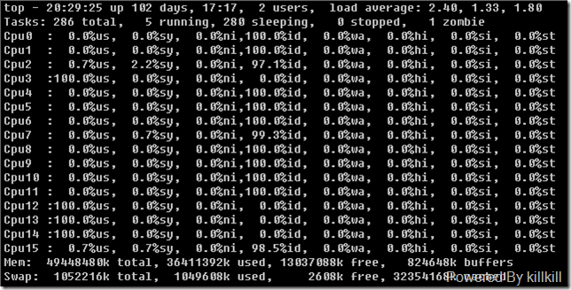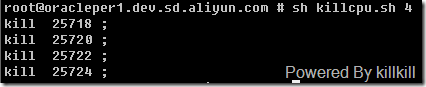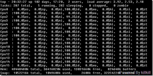 借助一個(gè)例子說(shuō)明,借助以前寫(xiě)過(guò)的一個(gè)消耗CPU的腳本 原]消耗CPU資源的shell腳本 ,將一臺(tái)16個(gè)CPU的機(jī)器上其中4個(gè)CPU的資源耗盡: