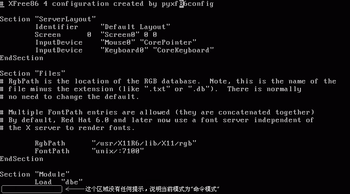 上圖為用vi打開/etc/X11/xorg.conf后的狀態(tài)。光標位于左上第一個字符下滑線的位置。