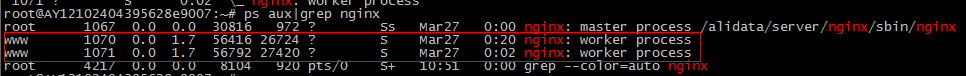 在linux里是可以通過ps 和grep來查詢到的。如下圖中使用ps aux|grep nginx來查詢nginx進程使用什么賬戶運行的: