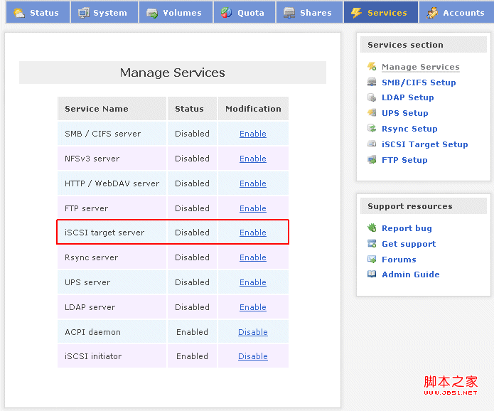 要控制服務(wù),我們使用 Openfiler Storage Control Center 并轉(zhuǎn)到 [Services] / [Manage Services]: