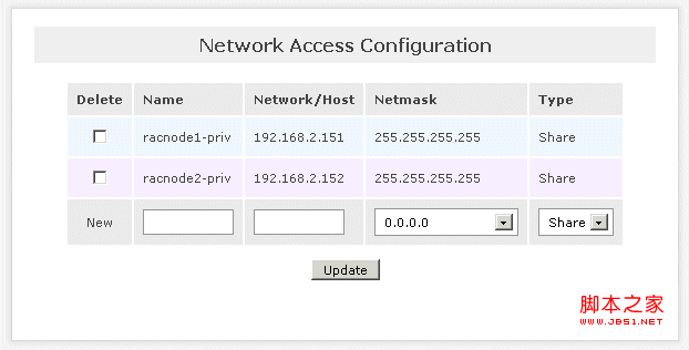 下一步是配置 Openfiler 中的網(wǎng)絡(luò)訪問(wèn),指定需要通過(guò)存儲(chǔ)(專用)網(wǎng)絡(luò)訪問(wèn) iSCSI 卷的兩個(gè) Oracle RAC 節(jié)點(diǎn)(racnode1 和 racnode2)。注意,本節(jié)稍后將會(huì)創(chuàng)建 iSCSI 卷。另請(qǐng)注意,本步驟并不實(shí)際授予兩個(gè) Oracle RAC 節(jié)點(diǎn)訪問(wèn) iSCSI 邏輯卷所需的相應(yīng)權(quán)限。授予權(quán)限的操作將在本節(jié)稍后通過(guò)對(duì)每個(gè)新邏輯卷更新 ACL 來(lái)進(jìn)行。