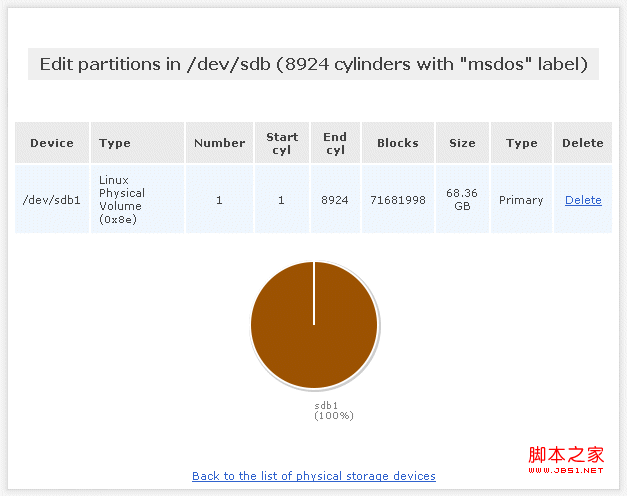 我們要執(zhí)行的第一步是在 /dev/sdb 內(nèi)置硬盤上創(chuàng)建一個(gè)主分區(qū)。單擊 /dev/sdb 鏈接,我們會(huì)看到“Edit”或“Create”選項(xiàng),分別用于編輯和創(chuàng)建分區(qū)。由于我們將創(chuàng)建一個(gè)跨整個(gè)磁盤的主分區(qū),因此可以將大多數(shù)選項(xiàng)保留為默認(rèn)設(shè)置,唯一的修改是將“Partition Type ”由“Extended partition”更改為“Physical volume ”。下面是我為了在 /dev/sdb 上創(chuàng)建主分區(qū)而指定的值: