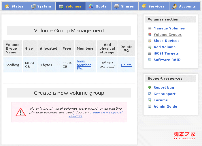 下一步是創(chuàng)建卷組。我們將創(chuàng)建一個(gè)名為 racdbvg 的卷組,其中包含新創(chuàng)建的主分區(qū)。從 Openfiler Storage Control Center 中轉(zhuǎn)到 [Volumes] / [Volume Groups]。我們將看到所有現(xiàn)有的卷組,或者什么也看不到(我們的情況就是這樣)。在 Volume Group Management 屏幕中,輸入新卷組的名稱 (racdbvg),單擊 /dev/sdb1 前面的復(fù)選框以選中該分區(qū),最后單擊“Add volume group”按鈕。之后,我們會(huì)看到一個(gè)列表,其中顯示出我們新創(chuàng)建的這個(gè)名為“racdbvg”的卷組: