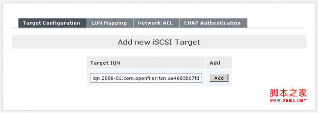 從 Openfiler Storage Control Center 中轉(zhuǎn)到 [Volumes] / [iSCSI Targets]。確保選擇了灰色子選項(xiàng)卡“Target Configuration”。您可在此選項(xiàng)卡頁(yè)中創(chuàng)建一個(gè)新的 iSCSI 目標(biāo)。系統(tǒng)會(huì)自動(dòng)生成一個(gè)默認(rèn)值,作為新 iSCSI 目標(biāo)的名稱(常稱為“目標(biāo) IQN”)。目標(biāo) IQN 的一個(gè)示例是“iqn.2006-01.com.openfiler:tsn.ae4683b67fd3”: