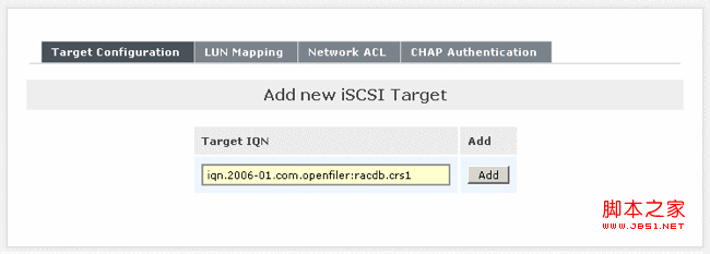 現(xiàn)在我們來(lái)創(chuàng)建三個(gè)新的 iSCSI 目標(biāo) — 為每個(gè) iSCSI 邏輯卷創(chuàng)建一個(gè)。下面舉例說(shuō)明通過(guò)創(chuàng)建 Oracle Clusterware/racdb-crs1 目標(biāo) ( iqn.2006-01.com.openfiler:racdb.crs1) 來(lái)創(chuàng)建新的 iSCSI 目標(biāo)時(shí)所需執(zhí)行的三個(gè)步驟。這個(gè)三步過(guò)程需要對(duì)上表中列出的三個(gè)新 iSCSI 目標(biāo)中的每一個(gè)都重復(fù)執(zhí)行一遍。