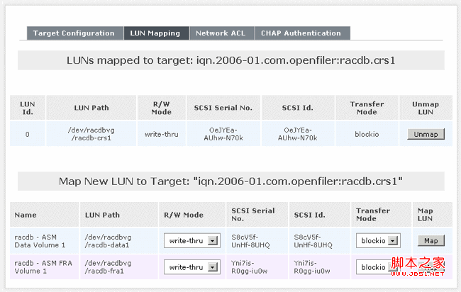接下來(lái),單擊名為“LUN Mapping”的灰色子選項(xiàng)卡(在“Target Configuration”子選項(xiàng)卡旁)。找到相應(yīng)的 iSCSI 邏輯卷(本例中為 /dev/racdbvg/racdb-crs1),然后單擊“Map”按鈕。無(wú)需更改此頁(yè)面中的任何設(shè)置。對(duì)卷 /dev/racdbvg/racdb-crs1 單擊“Map”按鈕后,您的屏幕應(yīng)如下圖所示: