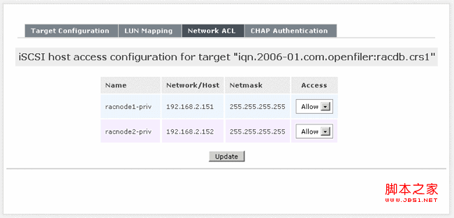單擊名為“Network ACL”的灰色子選項(xiàng)卡(在“LUN Mapping”子選項(xiàng)卡旁)。對(duì)當(dāng)前的 iSCSI 目標(biāo),將兩個(gè)主機(jī)的“Access”值由“Deny”更改為“Allow”,然后單擊“Update”按鈕。