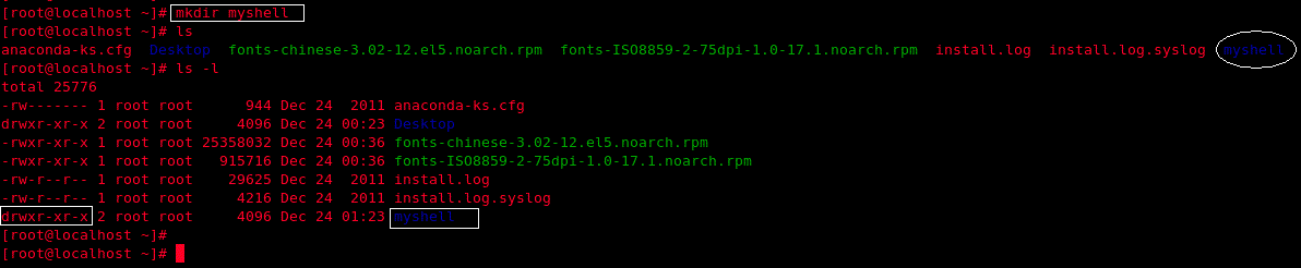 可以看到,新創(chuàng)建的目錄myshell的權限是:rwxr-xr-x,即: