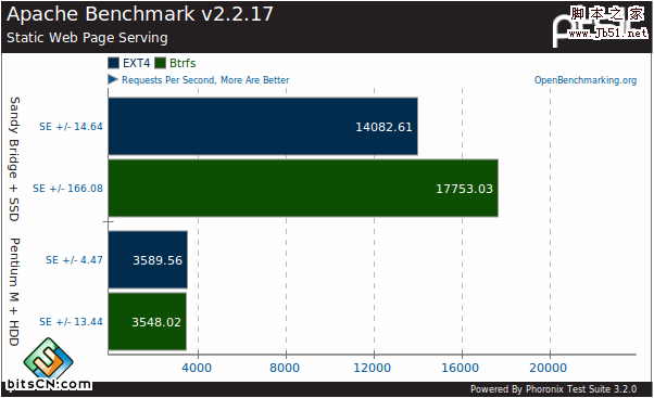測試使用apache靜態(tài)網(wǎng)站服務(wù),從文件讀取速度上,在高端筆記本電腦采用Sandy Bridge CPU 和 Intel X-25 SSD硬盤上,BTRFS遠(yuǎn)高于EXT4,速度更快,BTRFS的處理速度高出EXT4的24%。但是在另一款低端的筆記本奔騰M+HDD硬盤配置,兩個(gè)文件系統(tǒng)處理速度基本一樣,可能是因?yàn)镃PU瓶頸的限制。
