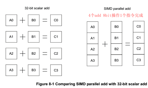 NEON采用SIMD架構(gòu),single instruction multy data,一條指令處理多個(gè)數(shù)據(jù),NEON中這多個(gè)數(shù)據(jù)可以很多,而且配置靈活(8bit、16bit、32bit為單位,可多個(gè)單位數(shù)據(jù)),這是優(yōu)勢(shì)所在。