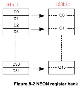 32個(gè)64bit寄存器,D0~D31;同時(shí)可組成16個(gè)128 bit寄存器,Q0~Q15。與VFP公用。