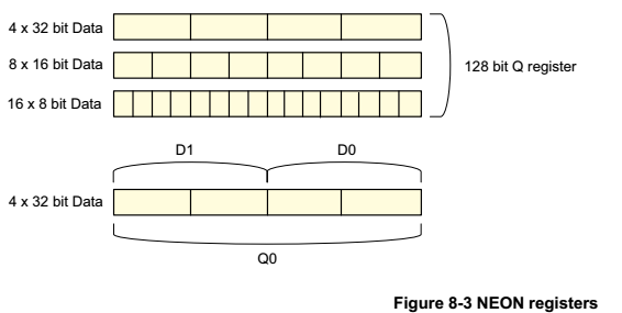 NEON也是load/store架構(gòu),寄存器為64bit/128bit,可形成向量化數(shù)據(jù),配合若干便于向量操作的指令。