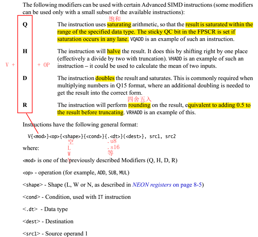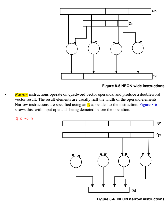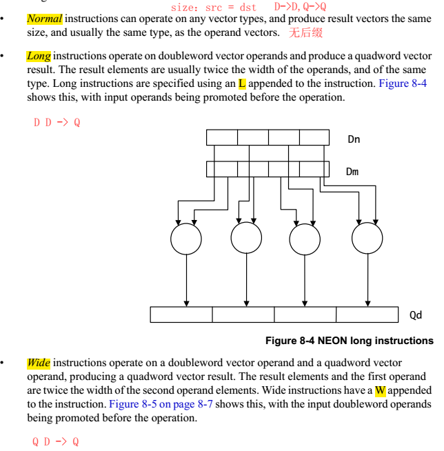NEON的指令有Normal,Long,Wide,Narrow和Saturating variants等幾種后綴,是根據(jù)操作的源src和dst寄存器的類型確定的。