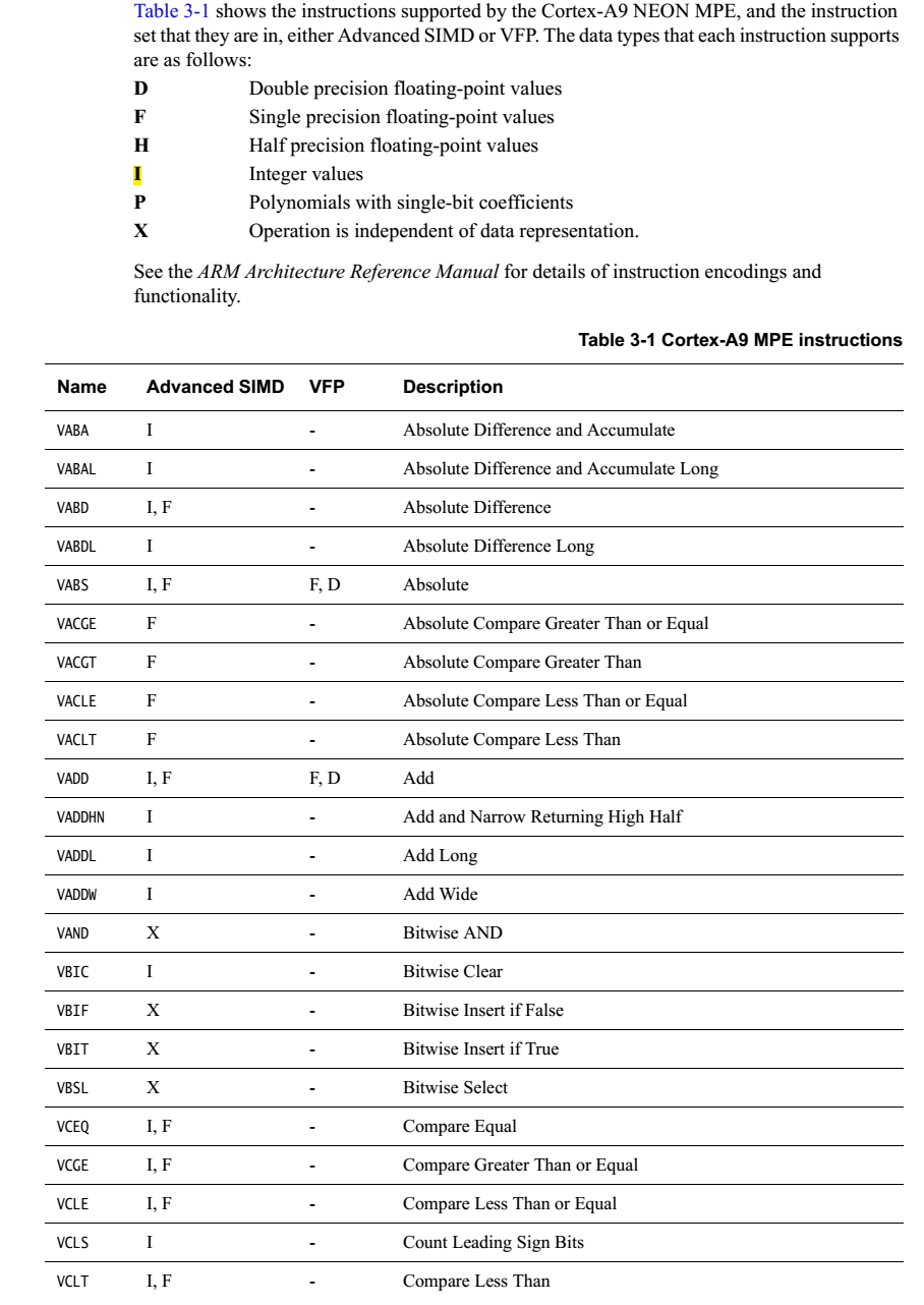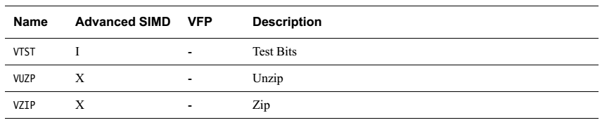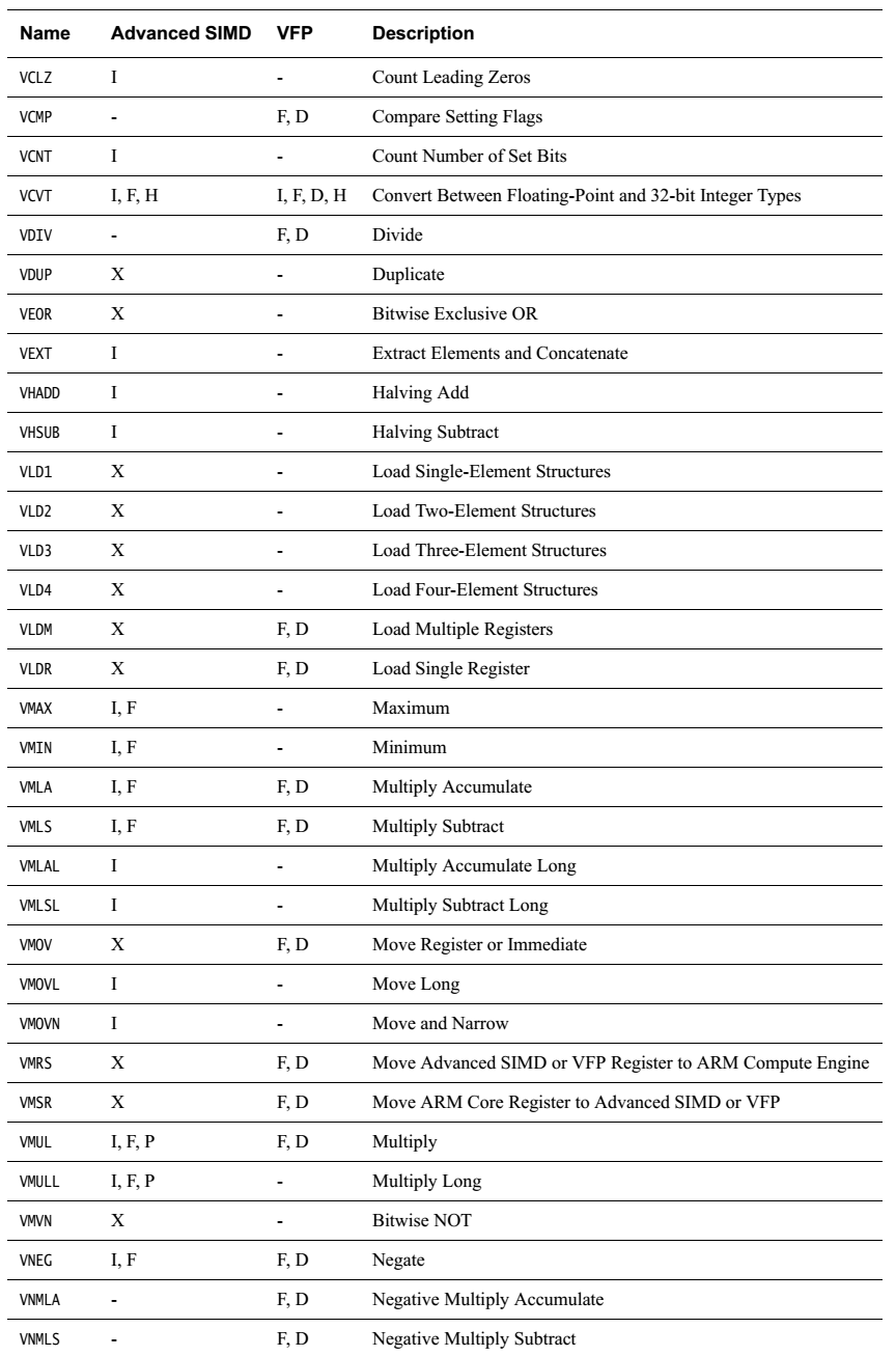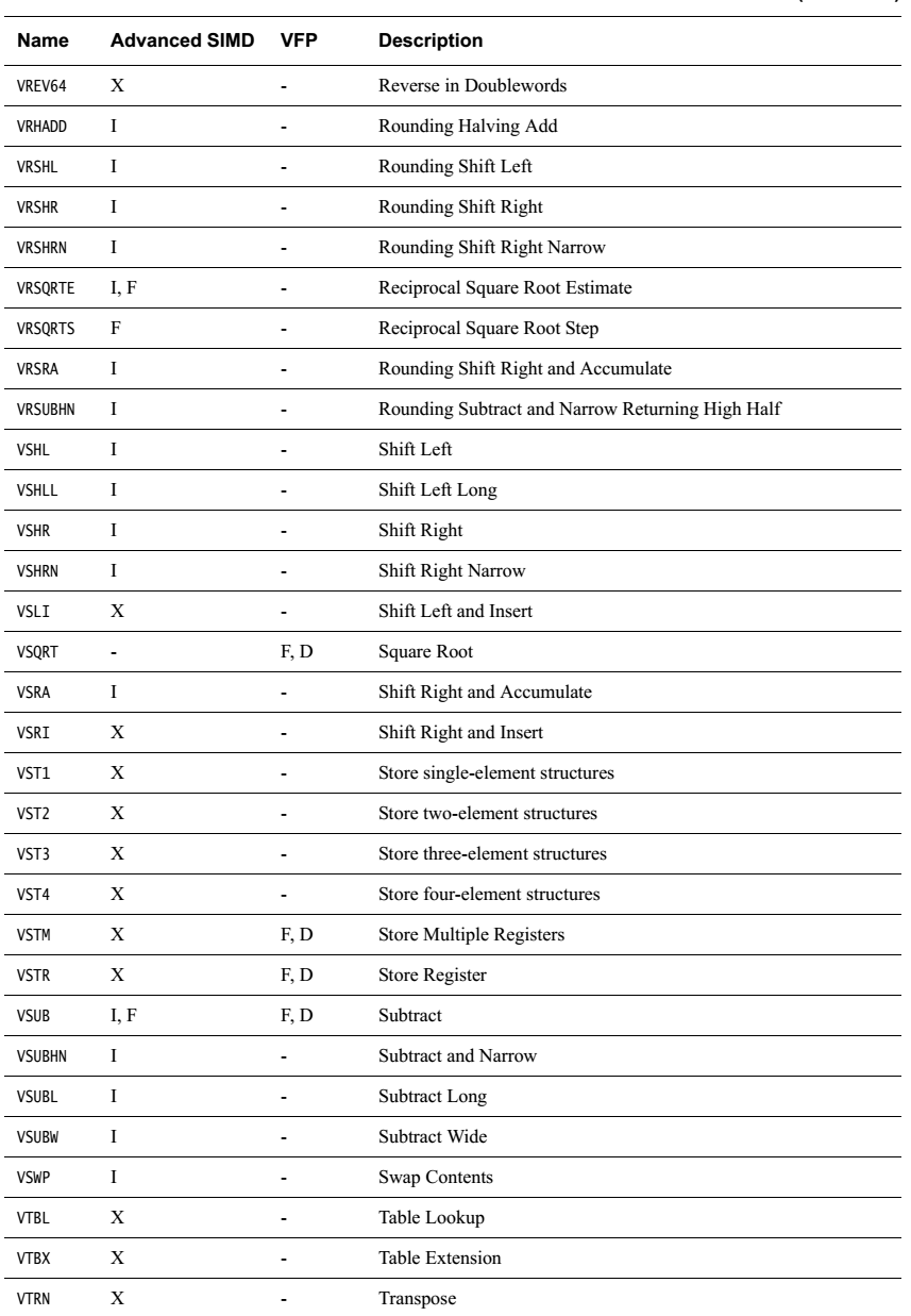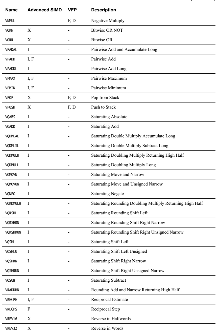 NEON general data processing instructions NEON shift instructions NEON logical and compare operations NEON arithmetic instructions NEON multiply instructions NEON load and store element and structure instructionsB.8 NEON and VFP pseudo-instructions