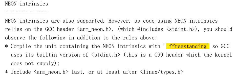 在linux里,應(yīng)用態(tài)可以比較方便使用NEON instrinsic,增加頭arm_neon.h頭文件后直接使用。但是內(nèi)核態(tài)下使用NEON有較多限制,在linux內(nèi)核文檔 /Documentation/arm/kernel_mode_neon.txt對(duì)此有詳細(xì)說(shuō)明。要點(diǎn)為: