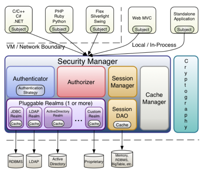 首先,來了解一下Shiro的三個核心組件:Subject, SecurityManager 和 Realms. 如下圖: