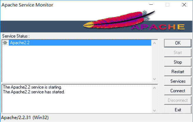 然后雙擊bin目錄下的ApacheMonitor.exe,點(diǎn)擊右邊的start啟動(dòng)服務(wù)器,如果正常,如下圖: