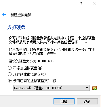 在建立虛擬硬盤(pán)步驟,選擇“使用已有的虛擬硬盤(pán)文件”,該文件筆者為G:\vmdisk\Centos.vdi,在第一次建立虛擬機(jī)安裝虛擬操作系統(tǒng)時(shí)時(shí)會(huì)創(chuàng)建該文件。