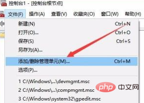 接著點擊彈出菜單中的“添加/刪除管理單元”菜單項。