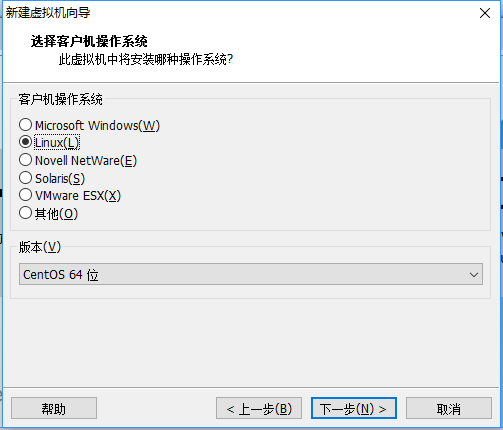 5.選擇客戶機操作系統(tǒng)為Linux,版本為CentOS 64位